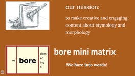 I'm thrilled to announce the launch of an orthography website created by 3 middle school students! See work created by them and other SWI students ranging from comics to essays to orthographic art. Join the "Boring" Scholars Collective (we "bore" into words) using the "contact us" button. On the contact page, you'll also find a form YOUR students can use to submit their work for consideration!
